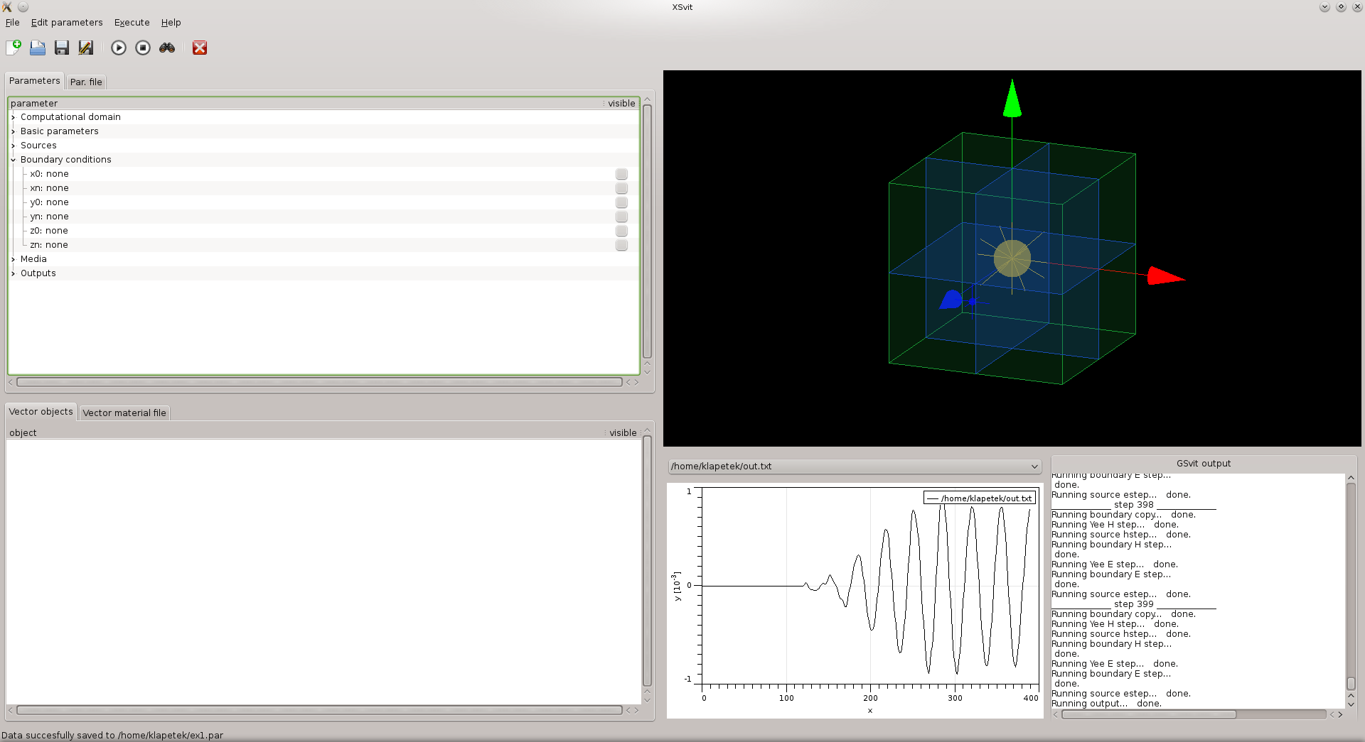 Quick startCheck the basic program operation example to run your first computation. Other examples are linked at bottom of this page. DocumentationXSvit is primarily a viewer of parameter files suitable for GSvit FDTD calculations. It cannot do anything except it, however it can simplify the process of parameter file creation and modification as it serves as a viewer and basic editor of parameter files. Its GUI can be shown in the following image: ![]() Technically the primary data in XSvit are the parameter file that is shown in the "Par. file" tab in left side of the screen. This represents the data directly as are used in GSvit. While loading this file or reloading it after any modification, XSvit goes through the parameters in it and constructs list of entries shown in tab "Parameters". By clicking on any of these entries, or by using the Edit parameters menu, we can adjust parameters or add some more of them. If we do so, parameter file is automatically written into a temporary location and reloaded back. This is to guarantee consistency of the parameter file with GSvit. As an alternative, we can also edit content of "Par. file" tab multiline text entry. If we do so, parameter file is dynamically reloaded as we type (and all the entries in "Parameter" tab are again refreshed). Note that the parameter file used within all the modifications is temporary, so it must be saved prior to computation or exiting the software. Similarily to parameter file, there is also material file and list of material entries representing "vector material" if such is used in the computation. Again, material file is the primary source of information and list of entries is only to assist the user dislaying it. At this version there is no GUI to edit the material file, it can be done only directly in "Mat. file" tab, according to GSvit syntax rules described in GSvit documentation. Which material file to show is governed by parameter file entry for "vector material". Therefore, chaning this entry also leads to loading another material file. Current temporary material file is saved automatically when we save the parameter file. Main screenThere are few key elements of the main screen that appear when you start XSvit: