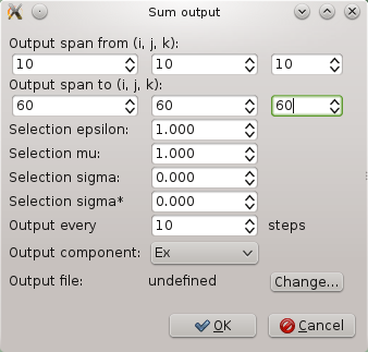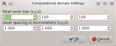 Note that at this version of XSvit, some amount of warnings and errors is still output to console, namely those related to parsing the parameter file (that is done by GSvit functions where a console output is normally used). This will change in future versions to get rid of the console (which is too unusual on Windows). DialoguesThere are many simple dialogues that can be used for entering different computation parameters. They can be invoked by double clicking on an entry in list of parameters at left side of the screen (this works only for parameters, not for material objects in this version), or by Edit parameters menu. To delete an entry in this version, you need to go to the parameter or materials file tab and delete it. Most of the dialogues are shown in some of the examples (see bottom of this page) in practice, here is their list as well. Note that many more details about realisation of different parameters are in computational core documentation. Parameter settings Global parameters that can be set are location of GSvit and Gwyddion executable. These are used for calling GSvit and Gwyddion directly from GUI, if we only want to create parameter files and run the computation and output visualisation elsewhere, we don't need them. Please note that on Windows OS the default installation path for GSvit binary is typically C:\Program Files (x86)\GSvit\bin\gsvit.exe. ![]() Computational domain settings There are two main computational domain parameters: voxel size (also called resolution in the documentation) and voxel spacing. Voxel size can be any (for any direction), however note that GSvit is 3D FDTD solver, so settings any dimension to e.g. 1 does not convert it to 2D solver. Voxel spacing should be the same for all the dimensions in this version, using different spacings is untested, even if in principle FDTD allows it. If we are in vacuum, voxel spacing should be at maximum 1/10 of the wavelength used. ![]() Basic parameters settings Several basic parameters influence the whole computation (all the algorithms): number of Yee algorithm steps (real time step is calculated automatically), verbosity level (0...3), use of multithreading based on OpenMP (-1...N) where -1 means use of all the available cores, and use of any of the available graphics card instead of processor. Note that verbose level should not be 0 to see anything in the text output (e.g. in log window in the GUI). On the other hand, high verbosity level might lead to some delays in GUI visualisation on MS Windows, so value of 1 seems to be optimum. If you have doubts whether graphics card is usable, you can run gsvit test 0 to perform basic test of Nvidia CUDA capable devices. Cards are counted from zero. ![]() Boundary conditions Computational volume typically needs to be terminated somehow and the following dialogue is used to set the boundary conditions. Different options can be chosen, starting from nothing (which reflects waves) up to Convolutional Perfectly Matched Layer conditions (for details see CPML boundary condition example). Note that even if in principle any boundary can have different boundary condition applied, it is not guaranteed that all the combinations (e.g. Liao + CPML) are working together properly. This dialog can be used also to set some boundary conditions within the material, now only peridic boundary conditions. To do so, you must specify where from and where to the space should be treated as periodic. ![]() Input of geometry of media There are two ways how to input objects in this version of GSvit. These can be defined voxel-by-voxel for all the voxels in the computational domain or defined using discrete objects, here also called as vector data (spheres, cubes,... up to tetrahedral meshes). Voxel-by-voxel data are not further visualised in XSvit, vector data are loaded automatically on basis of settings in this dialogue to the bottom widget showing material entities. ![]() Output settings Main general output setting is the output file where all the cross-sections (images) go to. It is Gwyddion file so it can be opened only by Gwyddion. ![]() Point source A simple dipole-like point source realised by setting field quantities in a single cell to a prescribed time dependency. We need to set its voxel position and waveform, that can be both loaded from a text file (containing total number of steps followed by sequence of these entries: index Ex Ey Ez Hx Hy Hz). This file ca be also automatically generated providing a sine wave source or sine wave damped by gaussian envelope. Note that for automatically generated files you need to have default directory set, by saving your parameter file somewhere or opening it from somewhere. Finally, two parameters theta and phi determine the source orientation. ![]() Scattered field source Scattered field source creates a plane wave by introducing its oposite to every face of a perfectly electric conductor. To use it you first need to have the conductor somewhere in your computational domain, and then also set the orientation of wave by the following dialogue. Other source conditions are same as for point source. For orientation details see the computational core documentation ![]() Total/scattered field source Plane wave can be also injected on some virtual boundary inside computational domain and removed at the other side. This approach is calle Total/scattered field source. To setup it we use the same parameters as to scattered field source, adding only definition of the virtual boundary where it is added/subtracted. ![]() Focused total/scattered field source This represents z direction oriented focused wave source using total/scattered field formulation with multiple plane waves decomposition according to algorithm published in I.R.Capoglu, A. Taflowe, V. Backman, Optics Express 23 (2008) 19208. In addition to definition of virtual boundary where it is added/subtracted, we need to define maximal angle of incoming light, focal distance in voxel units and