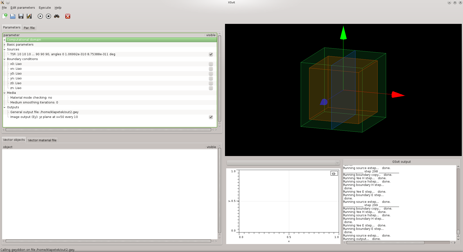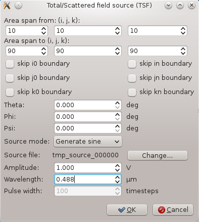 Setup all this with XSvitFirst, start the XSvit application. If haven't done this before, setup the location of GSvit and Gwyddion under File->Preferences menu, so you can run the calculation from the GUI and see the results afterwards. Otherwise you will be able to use GUI only for parameter file setup. Many details concerning basic use of XSvit can be found in basic appplication use example. Here we will focus only on additional parameters settings. First, we will set the basic parameters - computational space volume to 100x100x100 voxels and discretisation to 10 nm. We will compute 300 steps of the FDTD algorithm. This all can be set by double clicking on appropriate entries in the parameters list. Now we will add a Total/Scattered Field source. This can be done using menu entry Edit parameters->Add TSF source. The dialogue shown below appears. We set the point source properties, i.e. volume where it is used in voxel coordinates, its type (load from file or construct a temporary file for it with sine wave or sine impulse) and orientation (see the angles for TSF in GSvit documentation). Note that for automatically generated sources like that one that we have used we should set the default directory (e.g. by saving or opening parameter file) before setting the source. Adding a TSF source will create a plane wave inside the volume. ![]() We will also add one image output for Ey component displayed in the yz plane. After adding the source and outputs we can see it in the 3D window as shown below and also on the list of entries. ![]() Finally, we will set the boundary conditions to absorbing (Liao) in order to prevent reflection of light scattered in the computational volume (in next part of the example, now there is nothing to scatter). Now we can save the parameter file and afterwards run the computation. Image output comes to general output file that can be opened by Gwyddion open source software via a menu command. We can see an undisturbed plane wave traveling across computational volume. ![]() Now we can add some material into the computational volume, so we can see scattering of the plane wave. We will first add a perfect electric conductor sphere to the center. Adding material object cannot be done via dialogs in this version of XSvit, so we need to edit the material file. Click on "Vector material file" tab in material entries widget and setup a sphere (type of entity = 4) with radius of 20 voxels, position 50,50,50 voxels and PEC material (type of material = 10). This is done by writing: 4 50 50 50 20 10 Save this material file using File->Save material file as... into a file, here we have chosen filename smallsphere.txt. Then click on some of the entries in "Media" part of parameters and add file with this name When you have look on "Vector objects tab" you can see already your sphere listed there. This is how it show look as (note that we have it listed under media parameters already). ![]() Now, when you hit "Save" button, bot the parameter file and media file is saved, as you can see on the status bar. You can run the computation and afterwards view the output, you should see something similar: ![]() Let's use a different material of the sphere, e.g. with known dielectric properties. Modifying the material file to 4 50 50 50 20 0 3 1 0 0 we will let the sphere being transparent, with relative permitivity of 3, relative permeability 1 and zero losses. Dielectric properties can be also loaded from database, so having 4 50 50 50 20 99 SiO2means that wavelength of the source will be analysed and appropriate dielectric properties for the selected material (here SiO2) will be used automatically. Result can be seen on the following output. ![]() (c) Petr Klapetek, 2013 |
