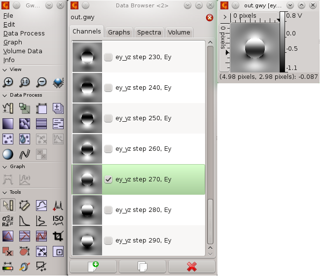 Scattered field source exampleSummaryWe will use cubic volume with Liao absorbing boundary condition and Scattered field plane wave source. Outputs cross-sections to a Gwyddion file and point values in three different locations in scattered field region to text files. A perfect electric conductor (PEC) sphere is located in the center. What can be tested in this configuration: