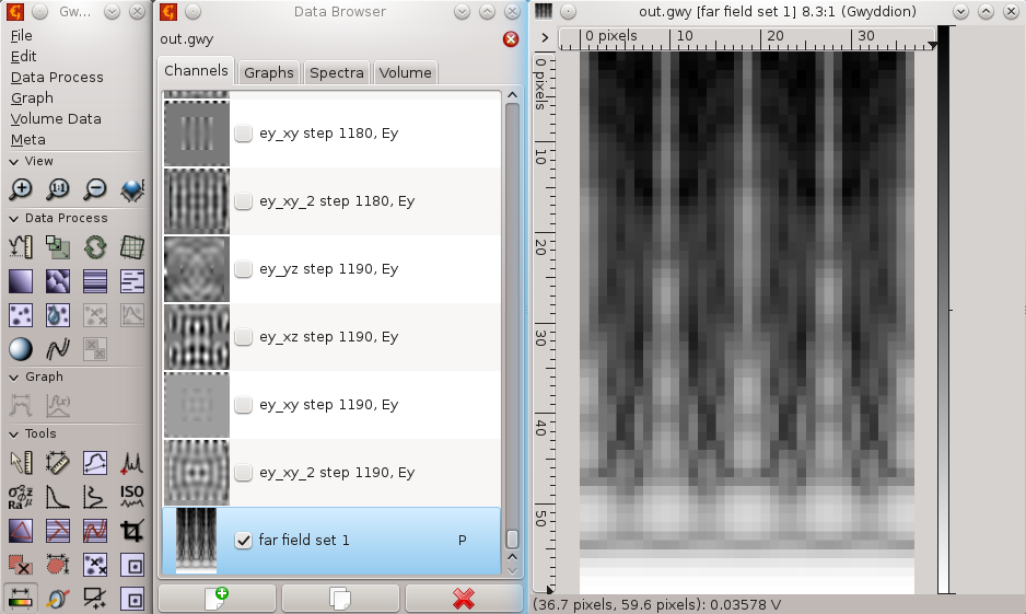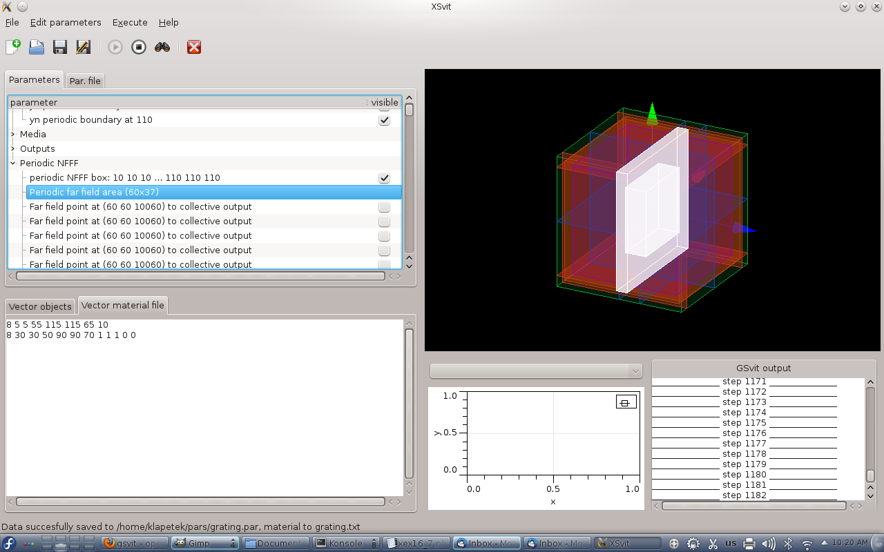 Difraction of light by a transmission gratingSummaryWe will setup cubic volume with a model of single grating aperture, absorbing boundary conditions, TSF source and we will evaluate diffraction pattern produced by the grating. What can be tested: