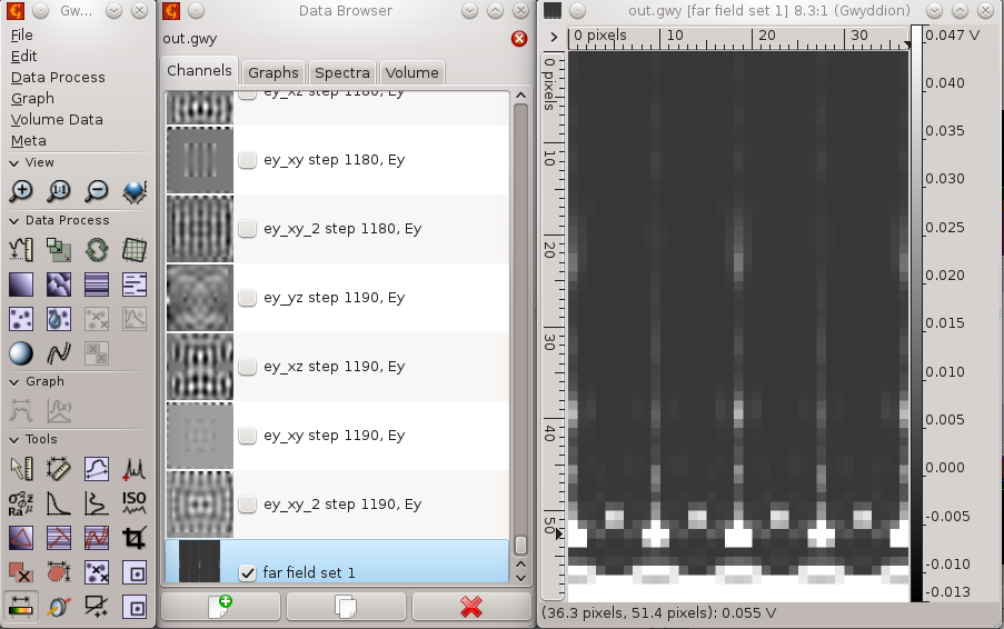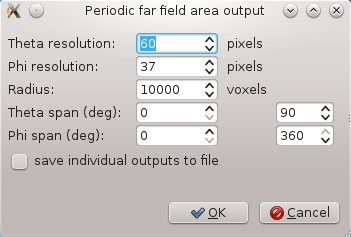We refer to basic appplication use example for details how to adjust all these settings. Then we save the parameter file if we haven't done it before. We will add simple model of a rectangular aperture now to the model. We will make an opaque screen and then a hole in it by writing 8 5 5 55 115 115 65 108 30 30 50 90 90 70 1 1 1 0 0 then we save it. Note that material objects are interpreted successively, so first we did a PEC object spanning over all the periodic volume and then we did an object with vacuum material conditions that cut part of it. Then we can save the material file using menu entry File->Save material file as... and we add the file to media entries in parameter list (by clicking on any of the Media items). Then we can add the periodic NFFF output by Edit->Add periodic NFFF area... which calls the following dialogue: ![]() Here we set the voxel radius of the evaluated area to some very large value and we set the angular span of the area to cover whole halfspace below the aperture. Then we set parameters of the integration boundary, like this: ![]() This means that for the beginning we won't use the periodic integration, only the area on the TSF boundary that is really calculated, that's why the integration spans from 0 to 1 in both x and y direction. After setting all this the complete setup should look like this ![]() Then we can run the computation. As a result we get not only plane outputs but also a plot of total far field scattering in the directions defined by our periodic NFFF area. Now this covers whole half-space so it should look like this: As there was no periodicity in NFFF integration this result is close to what we would get as single aperture diffaction (not exactly as for this we would not use periodic boundary conditions). ![]() We can increase resolution of the far field area (which affects speed a lot) or zoom somewhere if we want more detailed data. Next step is to calculate data from a periodic grating. Field is already periodic due to boundary conditions, but the far field integration is not. Ideally we would integrate over an infinite grating, but this would take infinitely long, and as you will see even quite small periodicity span takes quite long in present version of GSvit. We will change the periodicity of NFFF from 0..1 to -1..2 in both directions, which means that we will integrate over grid of 3x3 apertures. This leads to this result: ![]() The result is here not shown in logscale like previous one was, however if you compare either normal scale or logscale view you can see thai it got changed towards analytical solution for 3x3 grating. Again note that we were using periodic field (inifinitely) so combining this with such small periodicity in integration is not correct, however in many cases it is quite close to analytical solution. With larger span of periodic integration it gets better. It is also important to use enough long pulse signal and enough computation steps, so both these parameters should be larger for more accurate results. See application example for transmission grating for some more details. Here you can also download sample parameter file and material file. (c) Petr Klapetek, 2013 |
