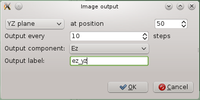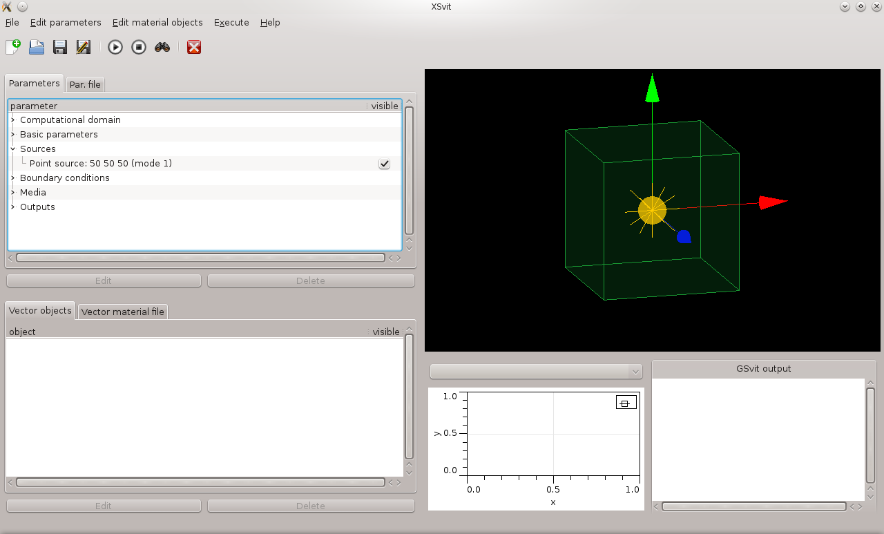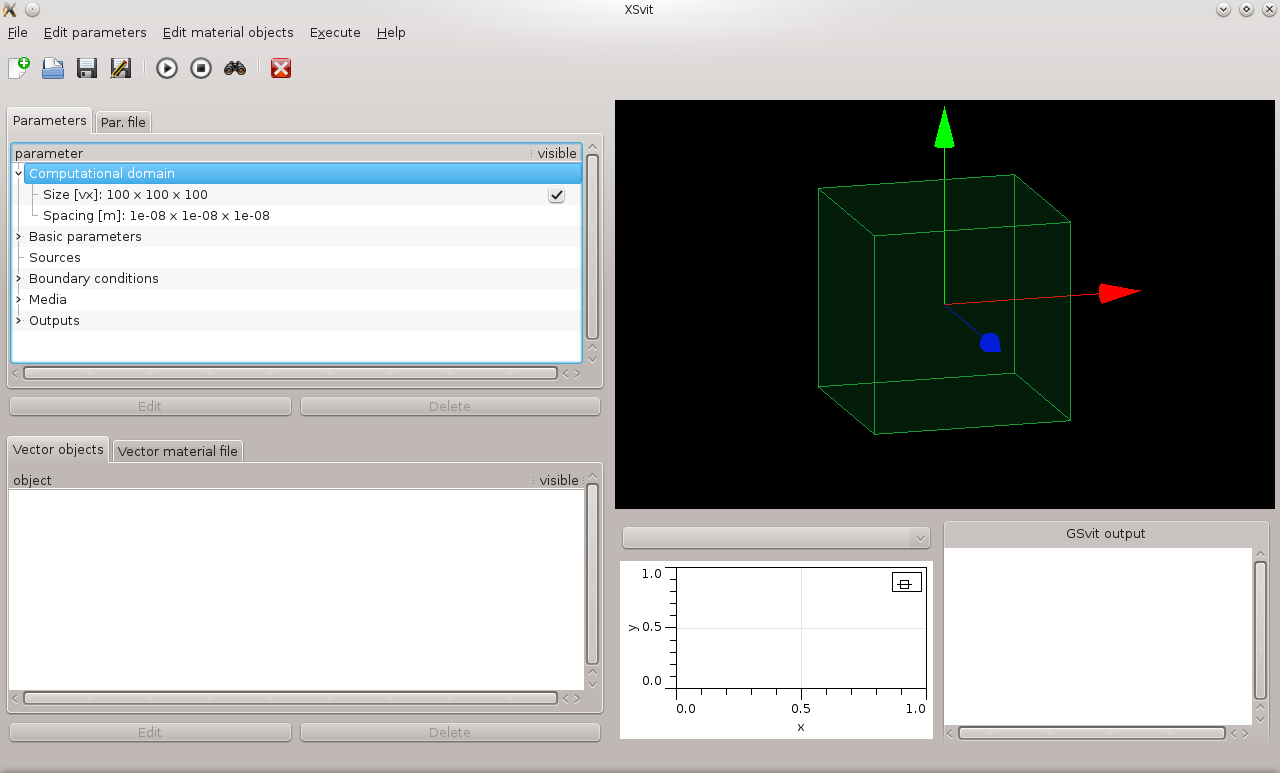 Setup all this with XSvitNote that some of the screenshots might be from an older version of XSvit. First, start the XSvit application. If haven't done this before, setup the location of GSvit and Gwyddion under File->Preferences menu, so you can run the calculation from the GUI and see the results afterwards. Otherwise you will be able to use GUI only for parameter file setup. When you start XSvit, there is already a default parameter file loaded, using computational space of size 100x100x100 voxels. We will use this computational space and we will add point souce and point output. In the next figure you can see how the default settings look after XSvit start (you can rotate the 3D projection by mouse, so this was done to get a better view). Note the values of discretisation step (1e-6 m) in the list of all the entries on the left side of the window; if we work in vacuum (which is the case in this example) we should not use source with wavelength that is smaller than this step multiplied by ten. You can alter the discretisation settings and computational volume size by double clicking on its values in the list. ![]() It is reasonable to save your parameter file at this stage using File->Save command. We can do it also later, just before running computation, however doing it right now will set the current directory and other input/output files set later can be referred to it (instead of using absolute path). Moreover, by saving parameter file we also set default directory for temporary files (e.g. generated sources), which is also important. First we will add point source. This can be done using menu entry Edit parameters->Add point source. The dialogue shown below appears. We set the point source properties, i.e. its position in voxel coordinates, its type (load from file or construct a temporary file for it with sine wave or sine impulse) and orientation given for temporary file sources by two angles (see the angles for TSF in GSvit documentation). Here we have chosen sine source given by Ez component only. ![]() After adding the source we can see it in the 3D window as shown below and also on the list of entries. If we are not satisfied with its position we can double-click on the entry and correct it. Hint: if we switch to "par. file" tab we can edit the source in native GSvit format file much faster and see the position changes immediately. ![]() Next we will add point and image outputs. This is done by menu entry Edit parameters->Add point output and Edit parameters->Add image output that again open dialogues for specifying how often (parameter "skip") and which component should be output. Point output is collected from a single point within computational volume and is stored into a text file. Image output comes to general output file that can be opened by Gwyddion open source software. A cross section in certain normal direction is output, selected as shown below. We will add a cross section in every direction, so we will call the dialog three times. ![]() Similarily we will add point output as shown below. ![]() Note that all the outputs can be also seen in 3D view window. We can adjust some more computational parameters, here namely we will increase number of steps to be calculated to 300 (clicking to any of the entries in "Basic parameters" group). Physical length of the time step is calculated automatically on the basis of space discretisation. ![]() Finally we need to save the parameter file if we haven't done it at beginning, as since now we worked only with a temporary file or at least modified file (it is important to save it always before running computation which is not done automatically). This is done by File->Save command as usual. Then we can start the computation clicking on the arrow in the toolbar or using Execute->Run menu command. Hint: if we don't want to use the GUI for starting the computation we can always run GSvit manually on our parameter file. ![]() While computation is running we can see the GSvit output (if the verbose level is not 0) and we can choose any text file output to be visualised in the graph window. The GSvit output is directly what you would see if you run it at console, with no GUI. Note that graph is updated at maximum as often as the data are saved, so if we skip every 100 points while setting the output we will see the graph updated only e.g. every few seconds (depending on computational volume size, etc.). When computation is finished or killed by the Stop command (again via toolbar or menu), we can open the output file. As most of the data are output in Gwyddion file we can directly open it using Gwyddion called from the menu or toolbar. Gwyddion is a powerfull 2D/3D data processing software, however we will only use it to see the images in this example. As image outputs are saved succesively as the GSvit is running, we will be probably having more channels to see in Gwyddion, so we pick what is interesting for us in the Gwyddion Data Browser. ![]() Note that in this example we have clicked on Data Process->Presentation->Logscale for every displayed output to see the data in better scale. We can see that in different cross-sections of the computational space there is a wave similar to a dipole output. If we check the data in further time steps, we can see that they look much worse. ![]() This behavior is caused by unset boundary conditions that behave like mirrors here. In order to let the wave go out of the computational space we need to apply an absorbing boundary condition, so we click on any entry in "Boundary conditions" set to change the boundary conditions on all the faces to a simple absorbing condition (Liao). ![]() After that (and saving the file, running computation and redisplaying data again) we can see that the output is already propagating freely outside of the computation volume. ![]() (c) Petr Klapetek, 2013 |