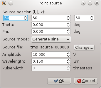Basic FDTD algorithm operation exampleSummaryWe will use cubic volume with centered point source, similar to a dipole located in center of computation space. Outputs will be different cross-section planes to Gwyddion file and a text file (from single point). Calculation will be performed on CPU or on GPU and material mode selection for speedup will be tested. What can be tested using this example: